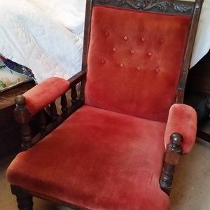 Wooden Victorian Arm Chair - With Velvet Upholstery. Overall size: Height 37" (94cm) Width 26" (66cm) Depth 31" (79cm) Seat height 14" (36cm) Buyer Collects