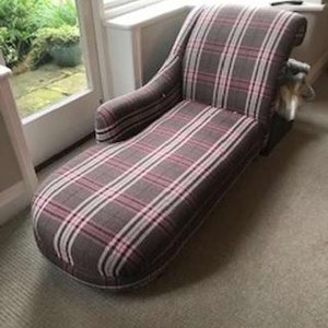 Beautiful chaise lounge from Laura Ashley. Re- upholstered in a pink and brown tartan. Very comfortable. The arm is on the right hand side of the chaise lounge. The chaise lounge is approximately 5ft 3" in lengh