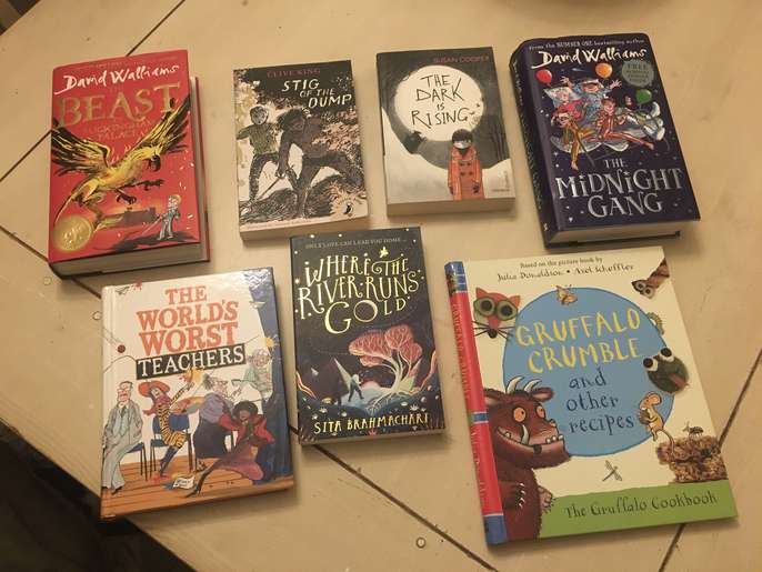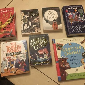 7 children’s books in good condition, some haven’t been read! Where the River runs Gold by Sita Brahmachari Stig of the Dump by Clive King The Dark is Rising by Susan Cooper The Midnight Gang by David Walliams (Hardback) The Beast by David Walliams (Hardback) The Worlds Worst Teachers by David Walliams (Hardback, spine a bit damaged, no dust jacket) Gruffalo Crumble & other Recipies by Julia Donaldson (Hardback)