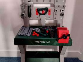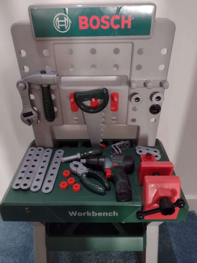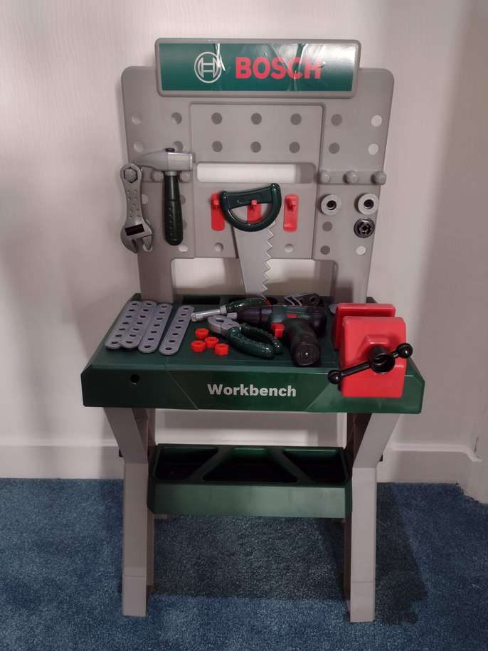 Bosch workbench, suit pre-school child. Includes spanner, working drill, screwdriver, vice, nuts and bolts. Perfect condition.