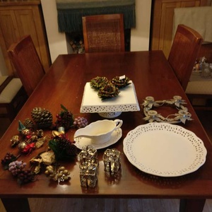 Christmas cake stand (24cm square) Pudding plate (30cm diameter) Sauce boat and saucer 3 candle decorations Silver metal Advent candle ring Christmas items used in table decorations