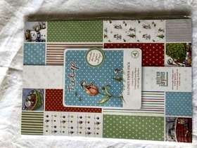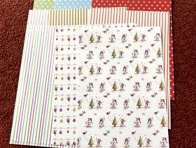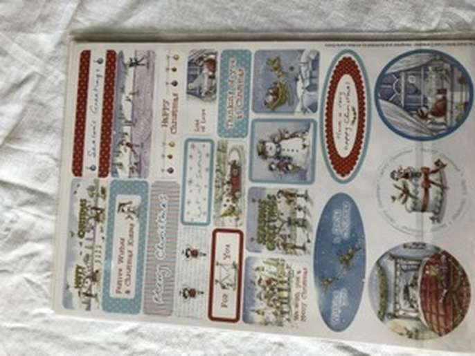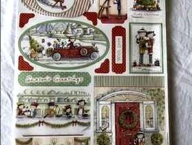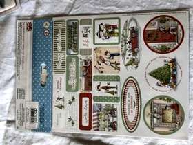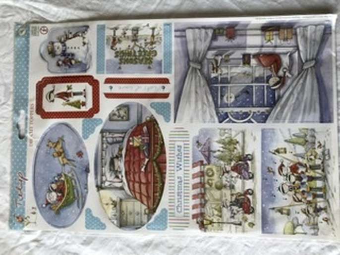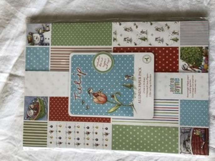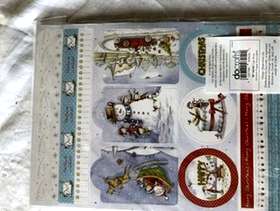 One pack of A5 linen paper approx 24 sheets, two die cut tags and borders. two decoupage card kits with envelopes, two sheets of die cut greetings, three easy cling Christmas stamps. two sheets of die cut toppers.