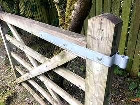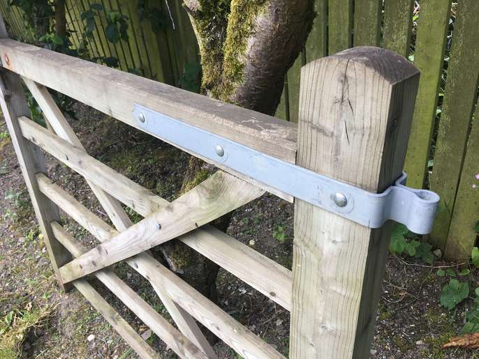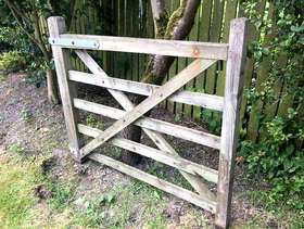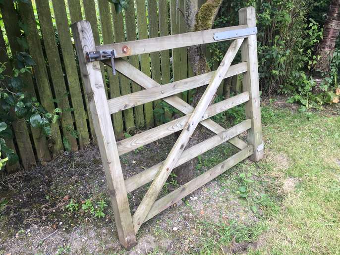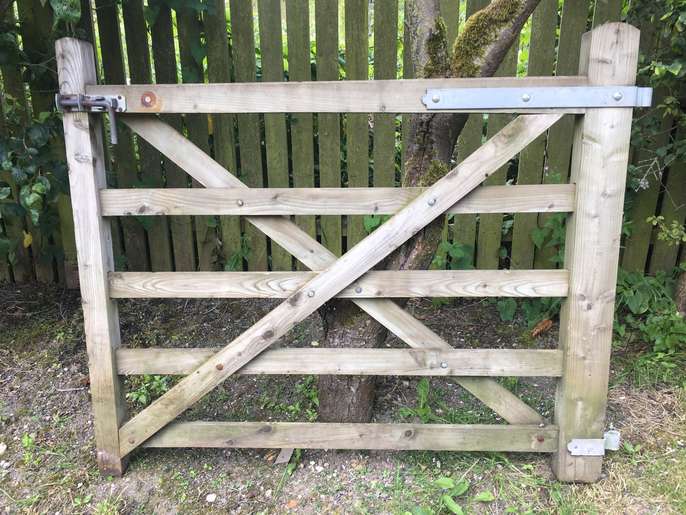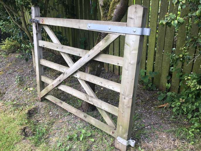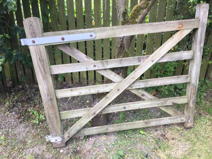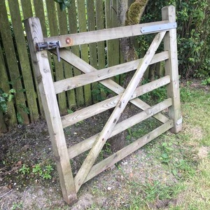 This is a very well made gate which stands 128 cm high and is 152 cm wide plus the hinge at 6 cm ready to hang with hinges attached and a bolt lock please note this is not the mass produced poor quality type the warps and bends within a few years that you can buy from dit stores