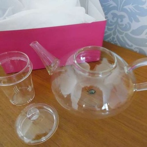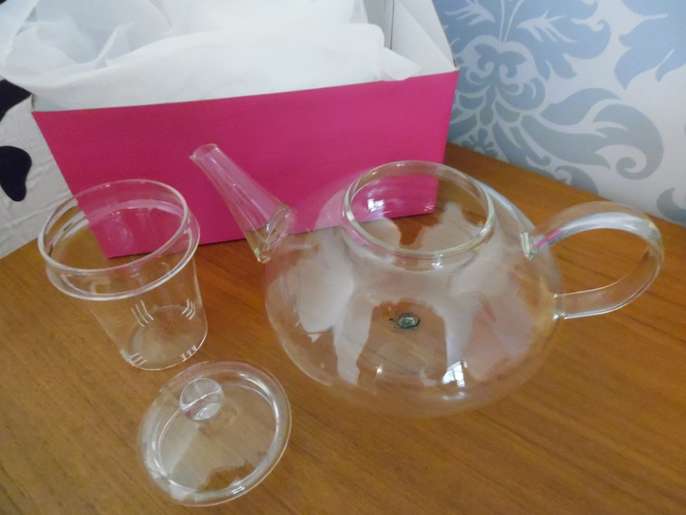 Prestige Clear Glass Teapot by the Exotic Tea company With glass infuser (for dried loose tea leaves or fresh herbs) Infuser can be removed for flowering teas Made from borosilicate glass which is dishwasher safe Includes pretty fuschia coloured box & free 50g pot of Mango Oolong tea (looseleaf) Ingredients for Oolong looseleaf tea = Oolong, rose buds, chamomile & mango (*NB best before date 04.06.19) (*Best before dates are advisories - the products are still safe to use after this, however pls note the BB date above) Teapot measures 22.5cm across (inc handle / spout) 11 cm with lid (higher if infuser inserted) / Volume 900-1000ml