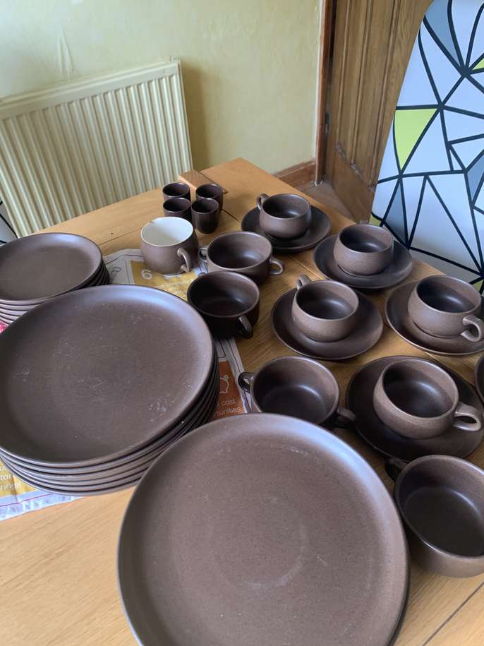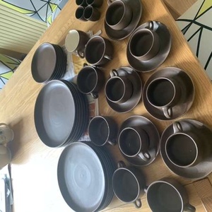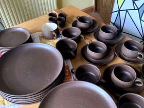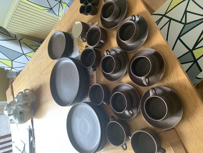 Dinner set included 6 plates in 3 different sizes, cups and saucers, soups bowls, milk jug and egg cups