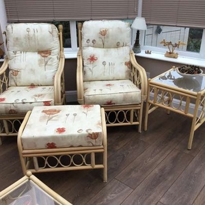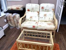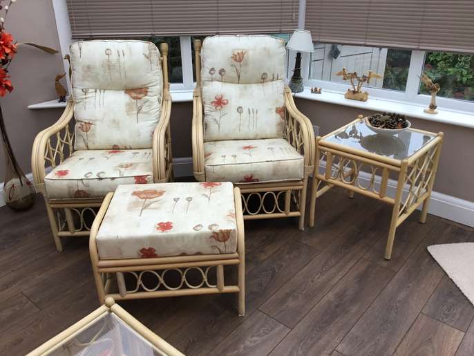 Conservatory furniture 2 Armchairs, 1 two seater, 1stall, large coffee table, small coffee table, and spare cushions.