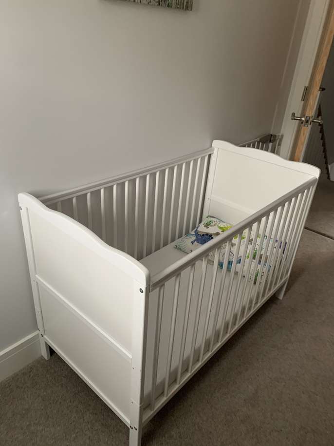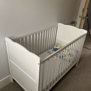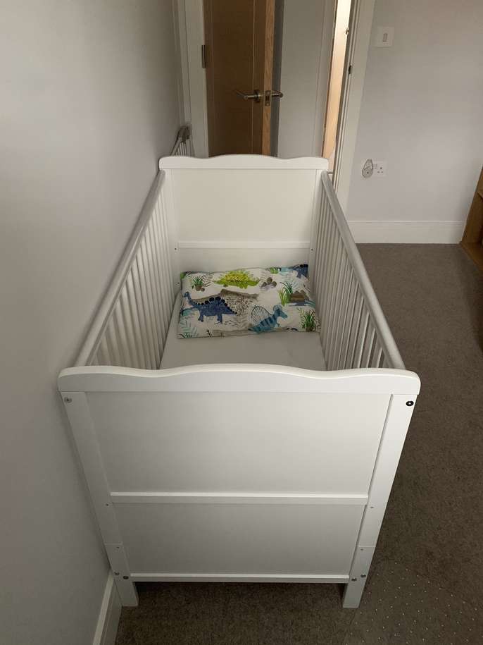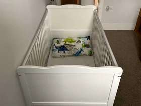 Cot /Cotbed Almost new in new condition, mattress, pillow and matching duvet cover featuring dinosaur pictures . Overall sizes 1245mm long x 655mm wide x 840mm high with up to 3 base frame levels Collection only