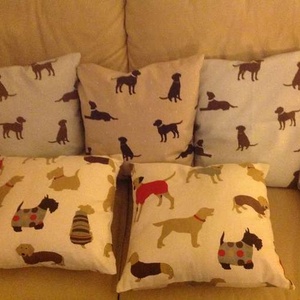 Three cushions Size 16 inches x16 inches £8 eachu Two Cushions. Size 15 inches x15 inches £8 each Each of these cushions are handmade at home and are new Dog Patterns on each cushion and would be ideal for dog lovers Colours:-Rear :-Two Pale Blue One Beige Front:- Both Cream Collection only
