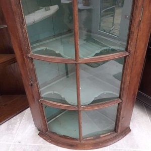 A 19th century corner cupboard that is a project for a restorer. It is 36 inches high and 26 inches wide. It has shaped interior shelves