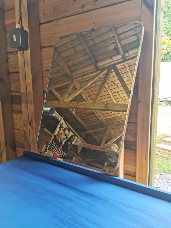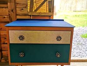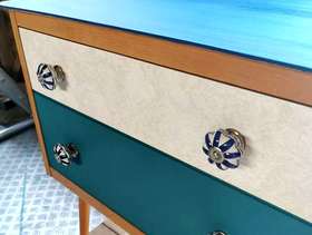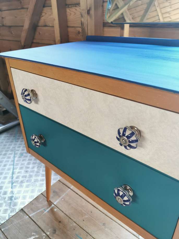 CWT SHIRLEY small chest of drawers. The mirror and legs are detachable and unnoticeable once unscrewed. Painted in Vintage with Grace Chalkpaint and will be sealed with Polyvine Ltd for extra durability. The first drawer is formica fronted, as is the original design, and both drawers are dovetailed. Replaced the original handles with new ceramic blue and white stripes for a bit of contrast. Measurements: drawers 24 inches wide x 27.5 inches high x 16 inches deep. Attached mirror is 18 inches high x 13 inches wide Available soon! Drop me a message if you're interested