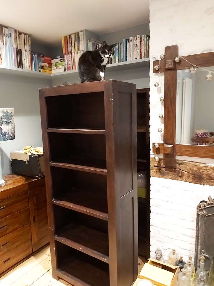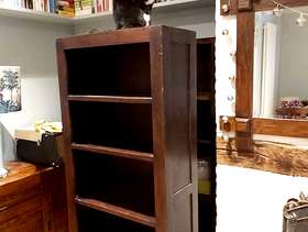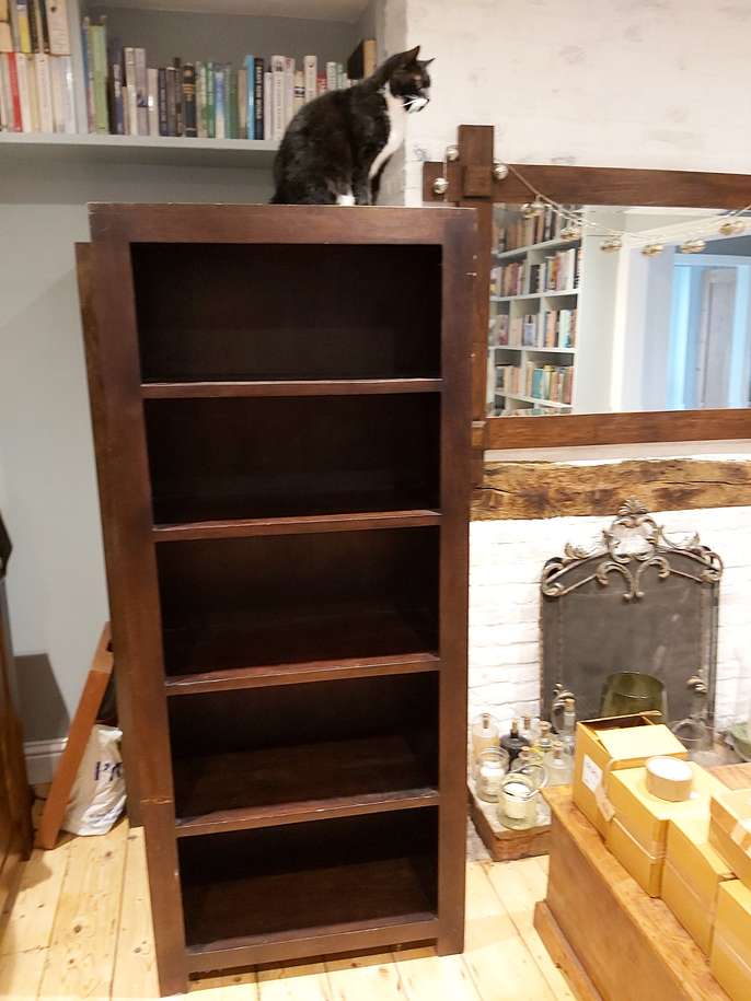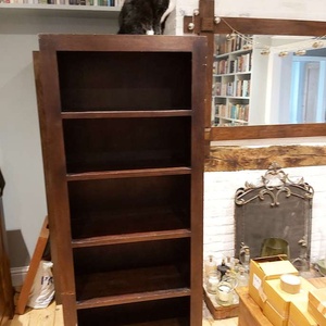 Dark wood bookcase , few scratches but these can be easily addressed. Would be good as a restore project.