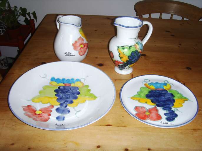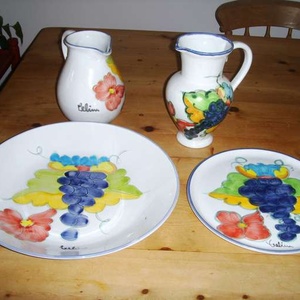Some lovely decorative china plates and jugs.4 in matching set, and one pretty souvenir frrom portugal, another from Tunisia no chips or crazing all beautiful show pieces