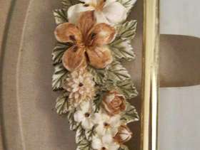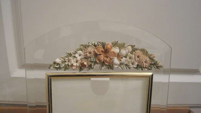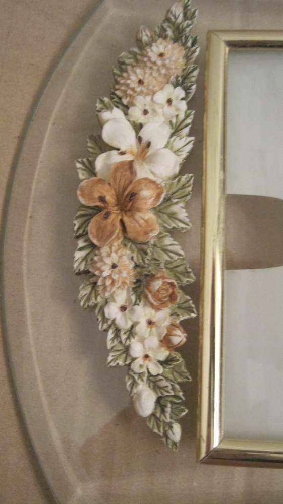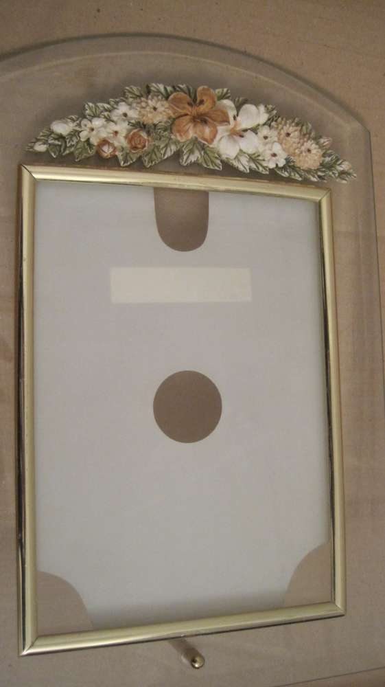 Decorative Glass frame with floral detail at the top Overall measurements 11" x 7.5" To hold photo size 7" x 5" approx Metal support at the back In good pre-owned condition Would post for £3.20