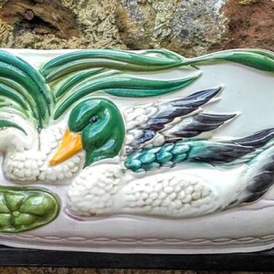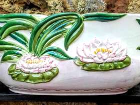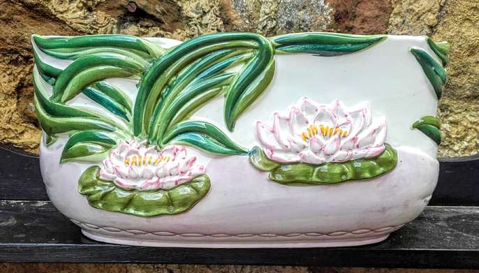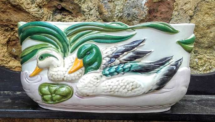 An unusual gorgeous plant pot holder with ducks on one side and water lilies on the other 13.5 " long 7 tall