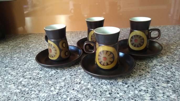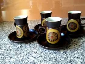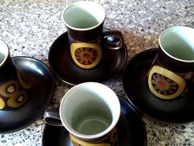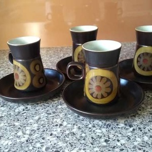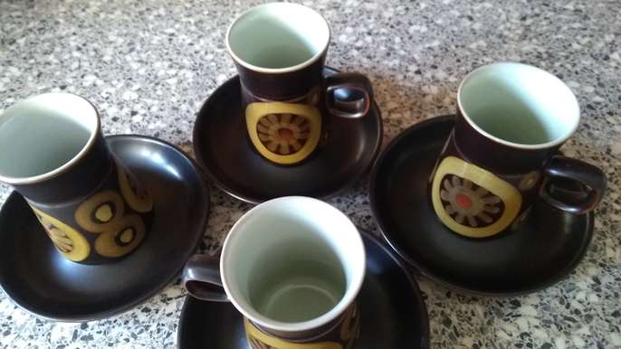 1970s Four Denby Arabesque Coffee Cups and Saucers in excellent condition with no cracks or chips - have had hardly any use