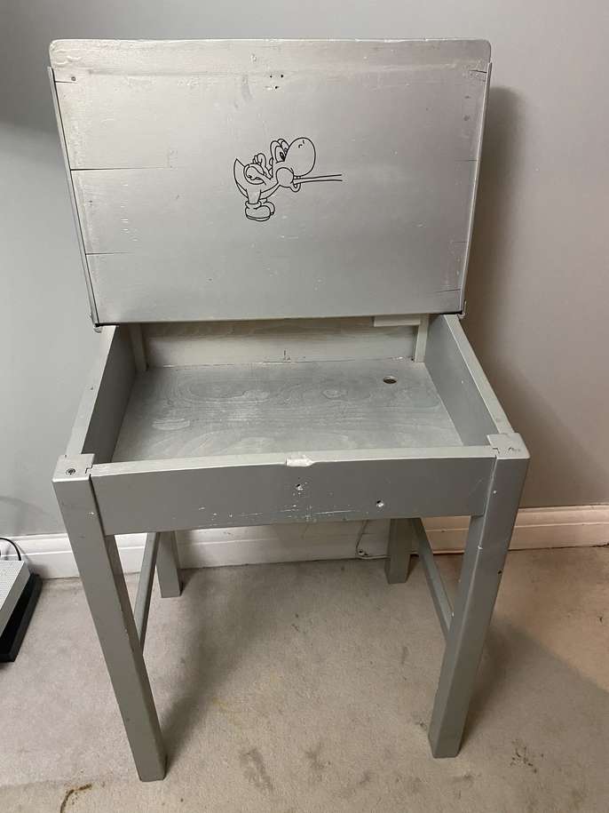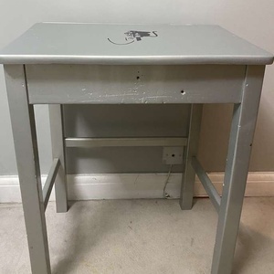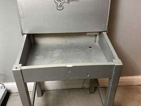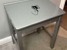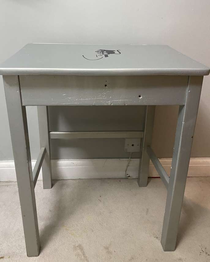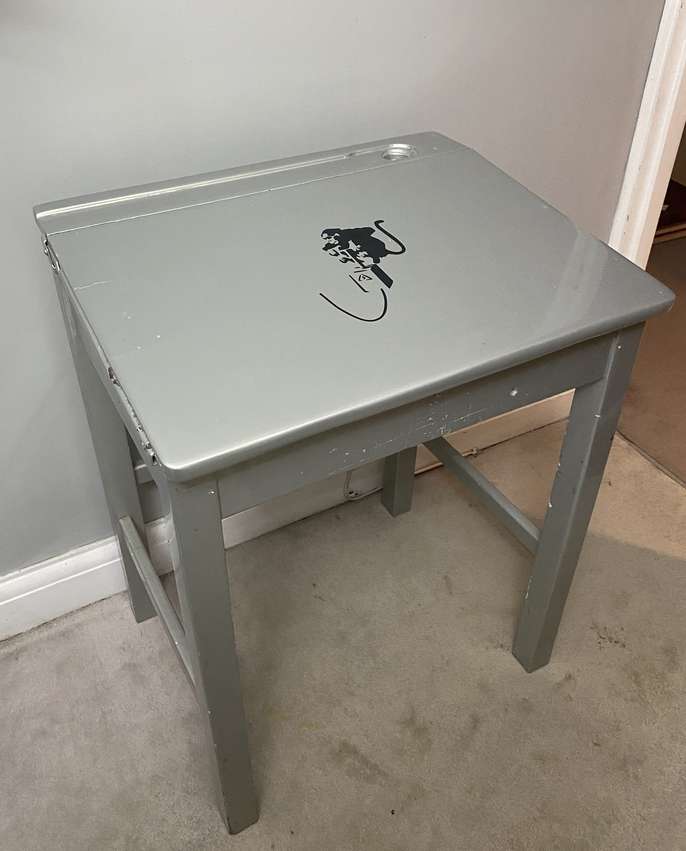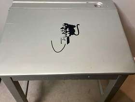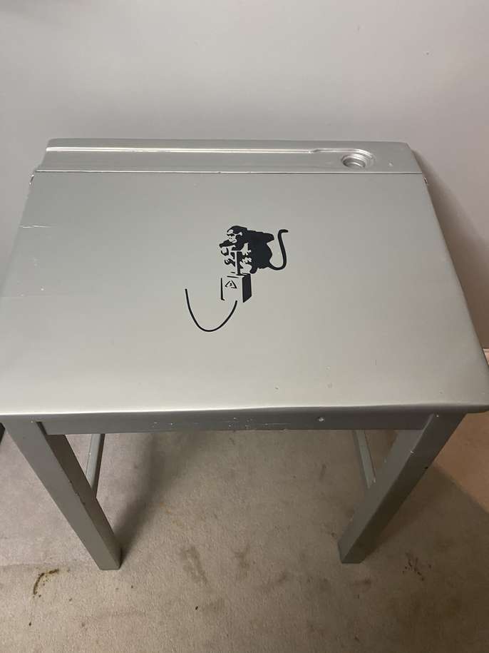 Old school desk which has been spray painted in silver and has a Bansky decal on the front