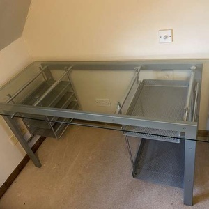 Glass top desk, metal/chrome. Storage trays underneath on both sides. 150L x 70W x 74H (cm) Collect only