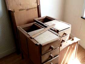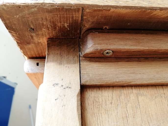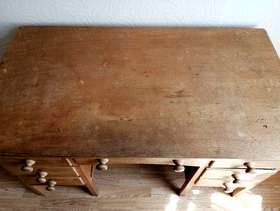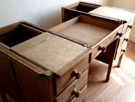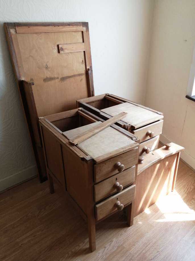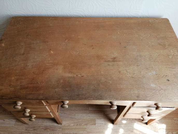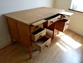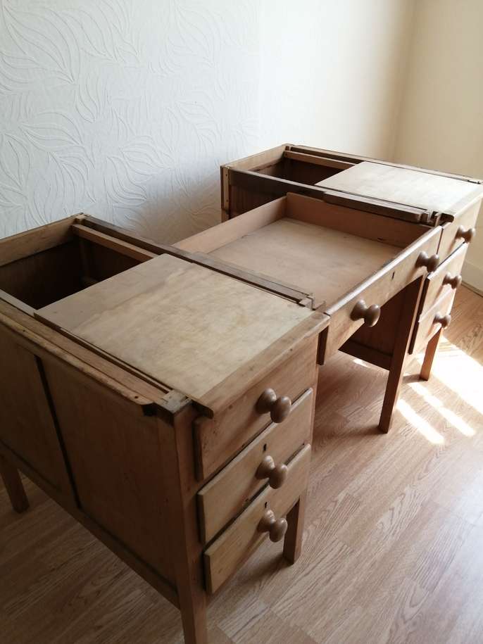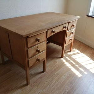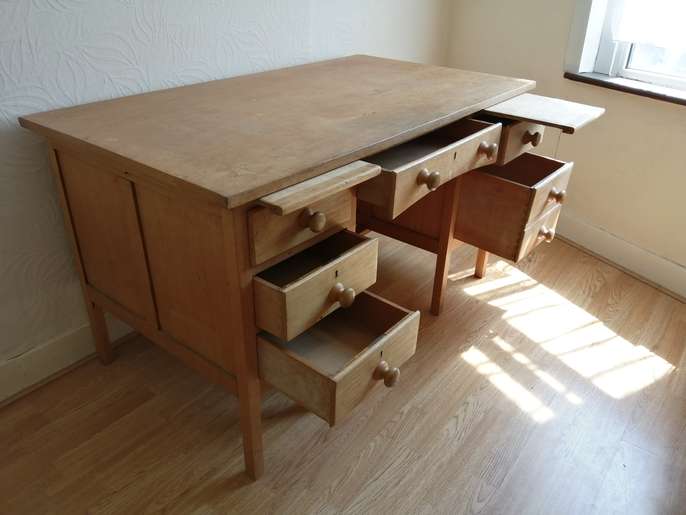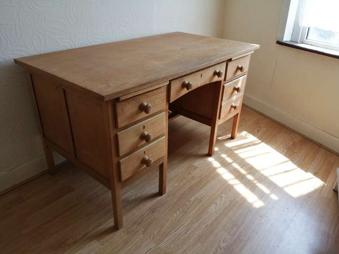 Classic school masters desk in used condition. A great sturdy desk usable as is or a great up-cycling project if you want to get stuck in with paint and varnish. Desk is currently disassembled for transport. See photos for condition and construction details. Measures 137.5cm wide, 76.5cm deep, 76.5cm tall when complete.