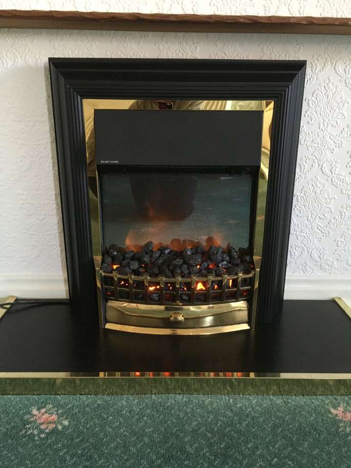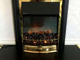 Dimplex Cheritan CHT20 Freestanding Fire with Optimum Flame. Has two settings, everything works well. Includes Mantle type shelf with brackets, and a hearth with brass edging for complete finish.
