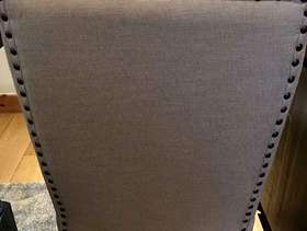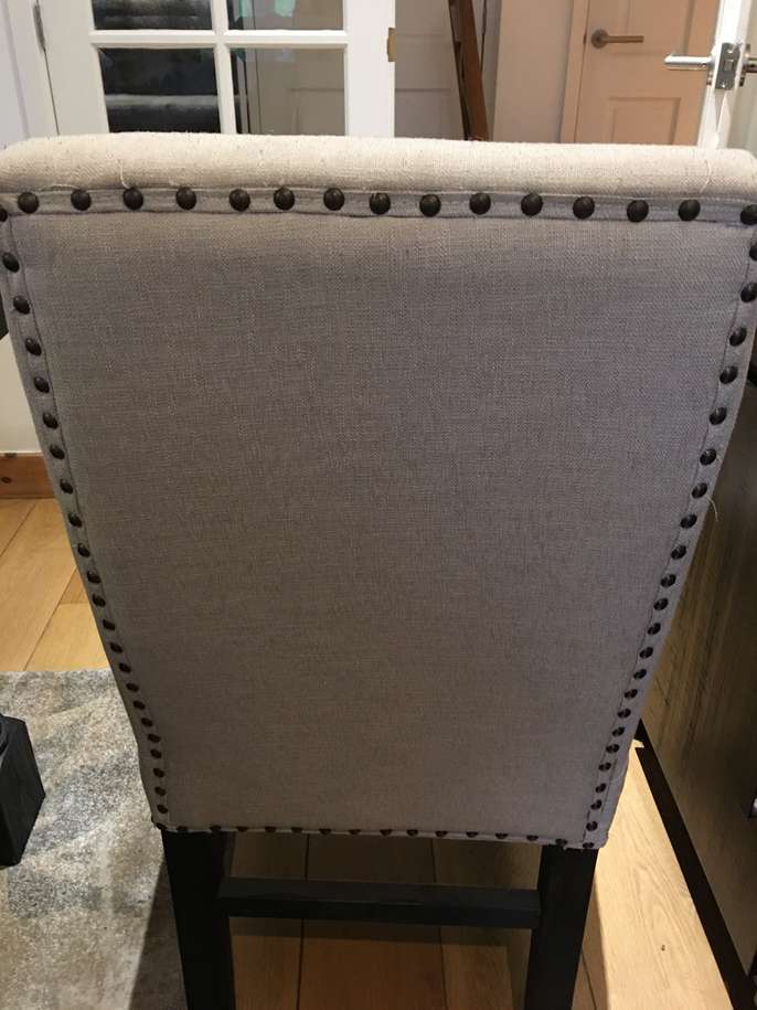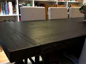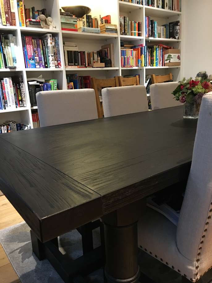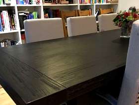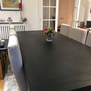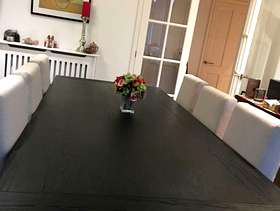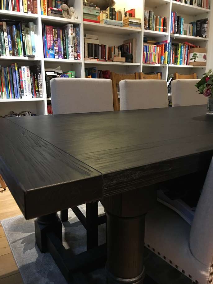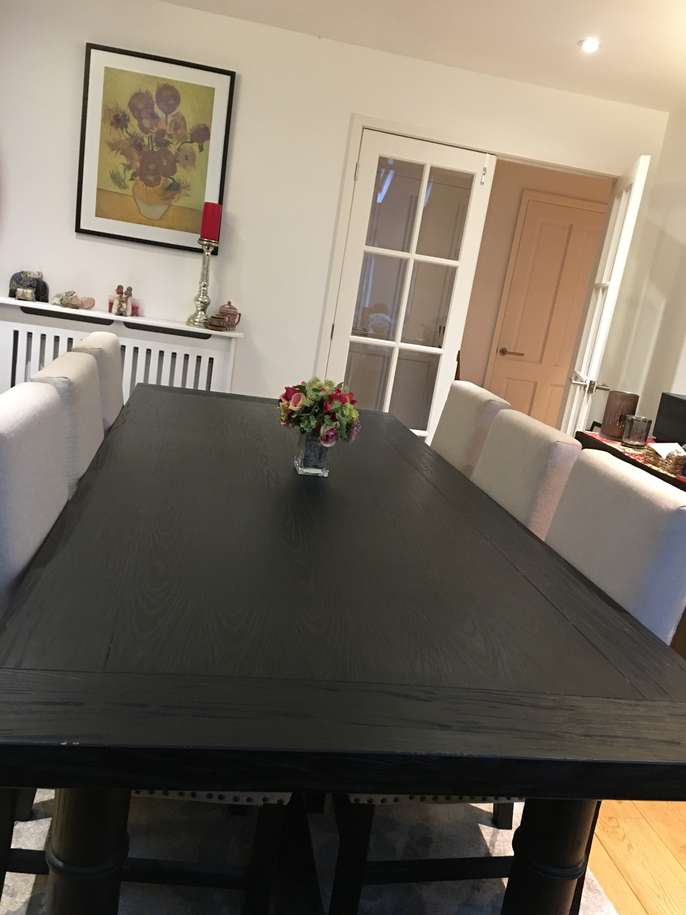 Very good condition - Black Bordeaux solid wood dining table and 6 throne chairs for sale Seats 8-10 people easily Product Information Table made from solid oak Chairs are stone fabric and braced Great for a large kitchen area or formal dining Condition - Very good. Table has one tiny mark on the edge. Product Dimensions Table Length 2.4m Width 1.05m