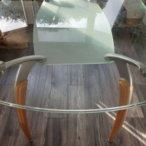 Oval glass top dining table with glass shelf underneath, solid wood and metal legs, seats 6 to 8 people, length 150 mm, width 90mm, height 78mm, excellent condition. Collection only.