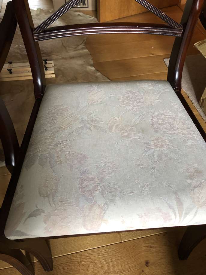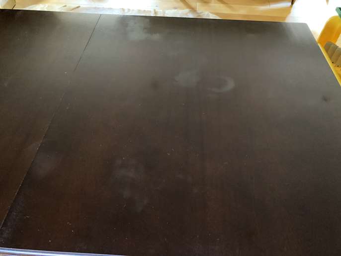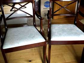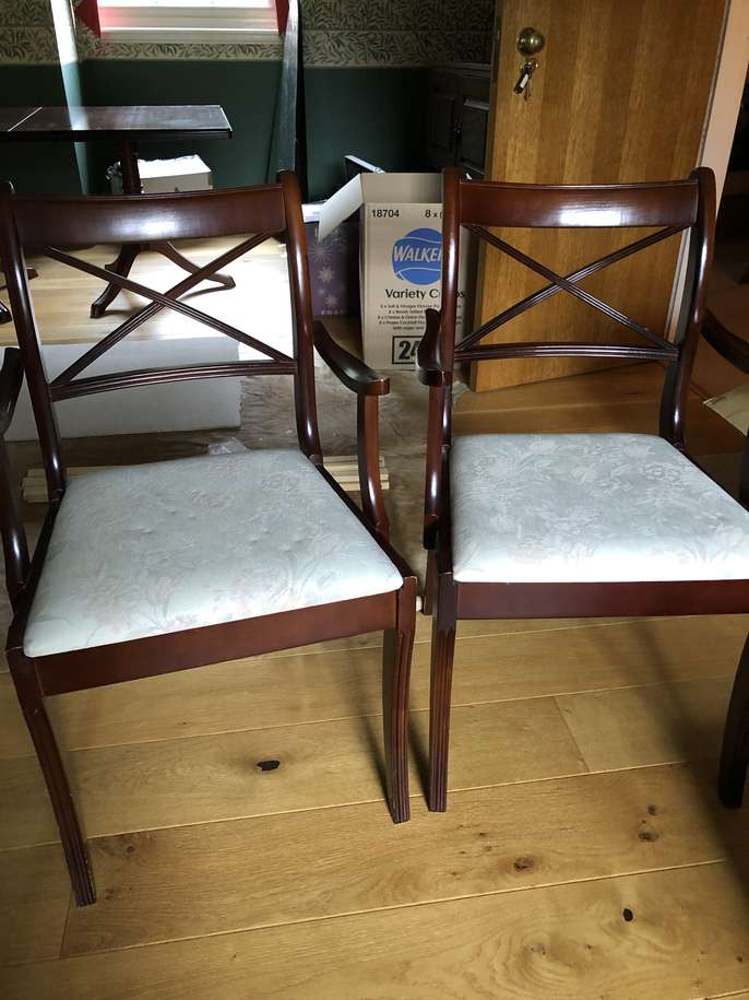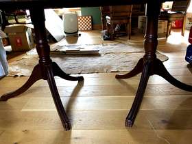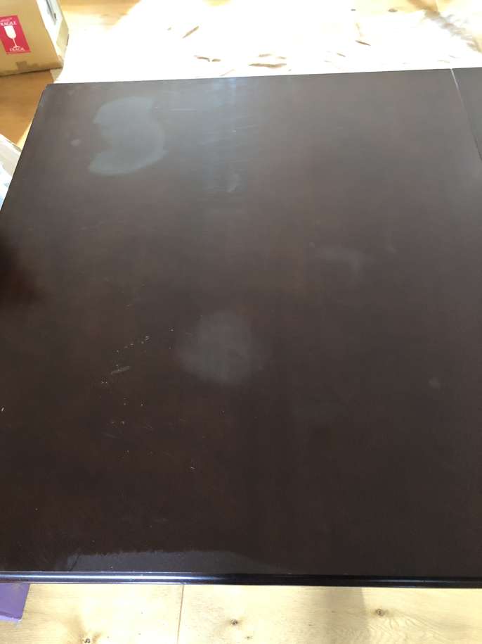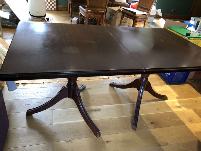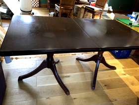 Mahogany dining table with two chairs. Marks on top of table. Needs polish or paint. Chairs good clean condition. No marks Collect in Banstead SM7