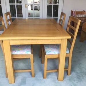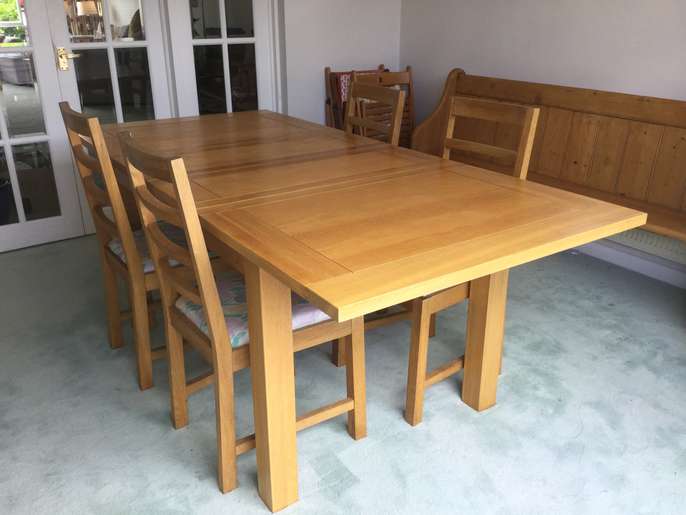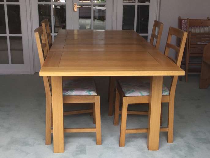 Solid oak extending table with four upholstered chairs. Very heavy and in good condition