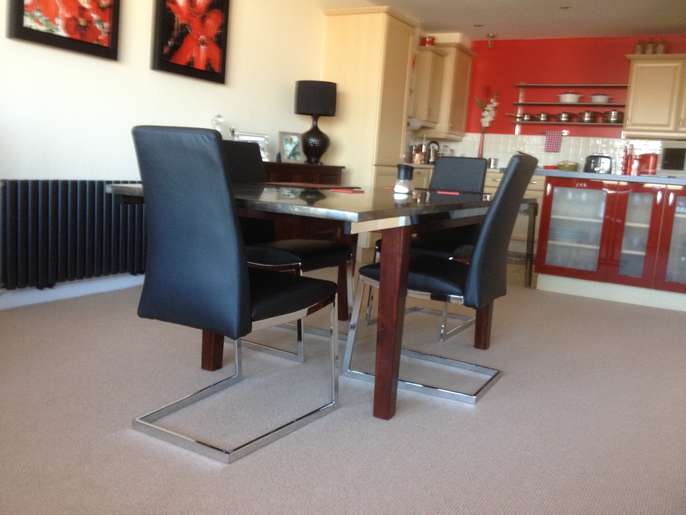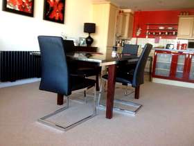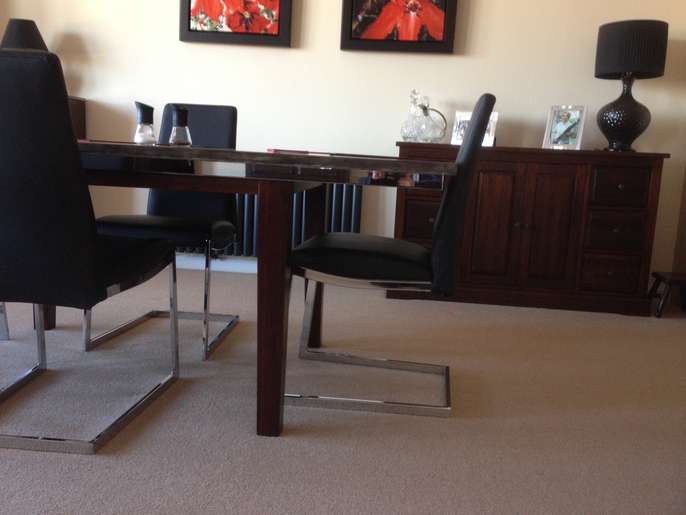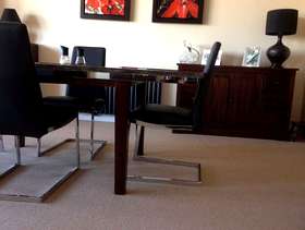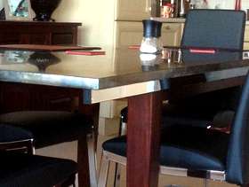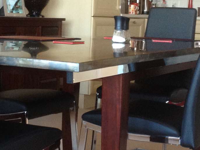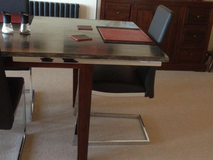 DINING TABLE ZINC / CHROME MAHOGANY LEGS plus 6 BLACK / CHROME CHAIRS. ABSOLUTELY FABULOUS BARGAIN TABLE DIMENSIONS 200 cm x 100 cm x 75 cm high PRICE OF ZINC TOP ALONE IS £1200 plus the table base plus the 6 chairs @ £50 each !!!!!! COLLECTION FROM SG5 1LN