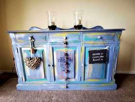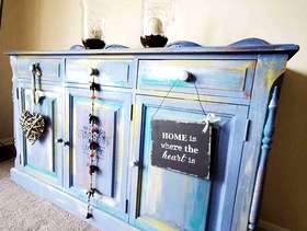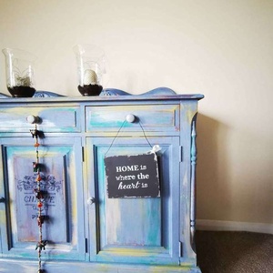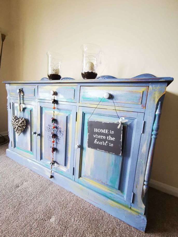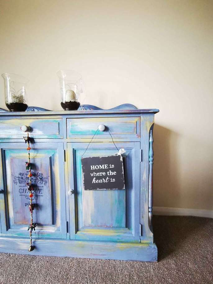 Upcycled shabby chic English solid pine sideboard. I have used a variety of different colours and paints such as Fusion Mineral Paint, Vintage with Grace, and Vintro Chalkpaint. The paint is self sealing, so you can use it as normal! Please note that this is not a new piece of furniture, so it may show some signs of wear, although, this does not affect its use in any way, and functions as it should Measurements: 81xcm high x 40cm deep x 137cm wide. **10% of proceeds will be going to the local food bank.** All drawers and cupboards are functioning as they should. Accessories not included. Collection is from Petersfield or I can obtain a quote for delivery nationwide, please message me first to obtain a more accurate quote. Please see my facebook page: SunnyStyle for other items!