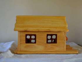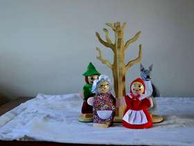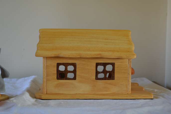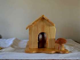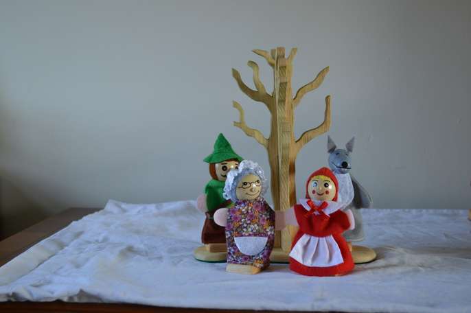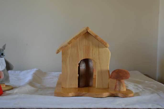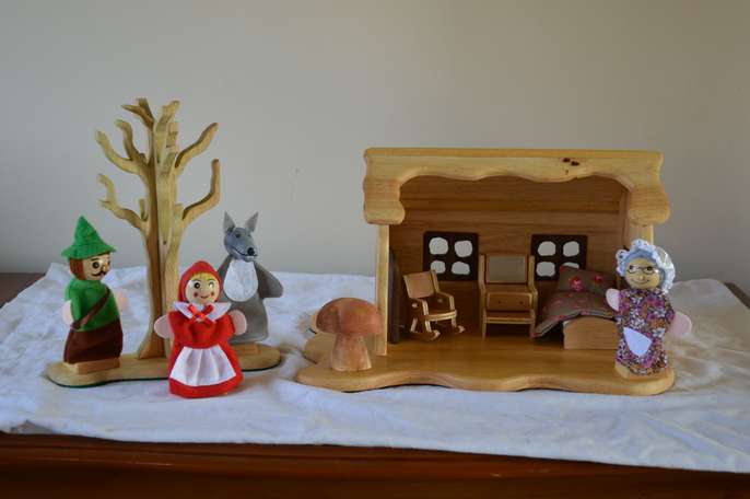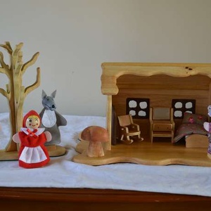 Red Ridinghood dolls house play set with finger puppets and accessories made from recycled pine wood , story telling and imagination play size of base 20cm by 30 cm , height 16cm, handmade original and unique, brand new