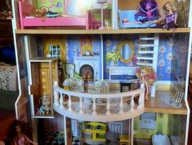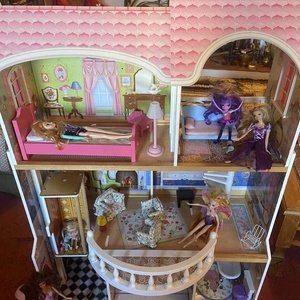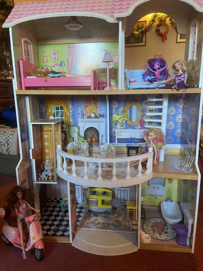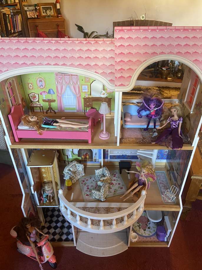 Dolls house that has a moveable lift & all shutters open. Furniture, dolls & scooter. Smoke free house