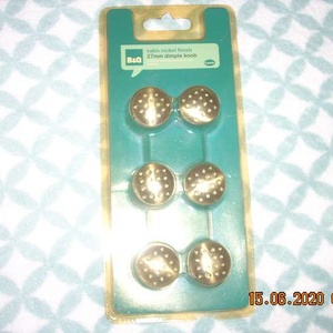 FOR SALE . Set of 6 satin nickel door knobs for cabinets and cupboards . Sealed new in pack with fittings .