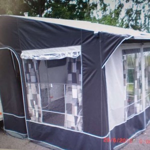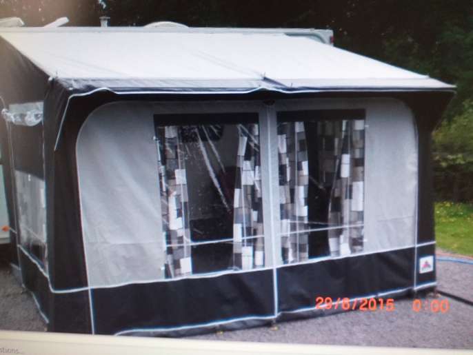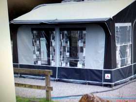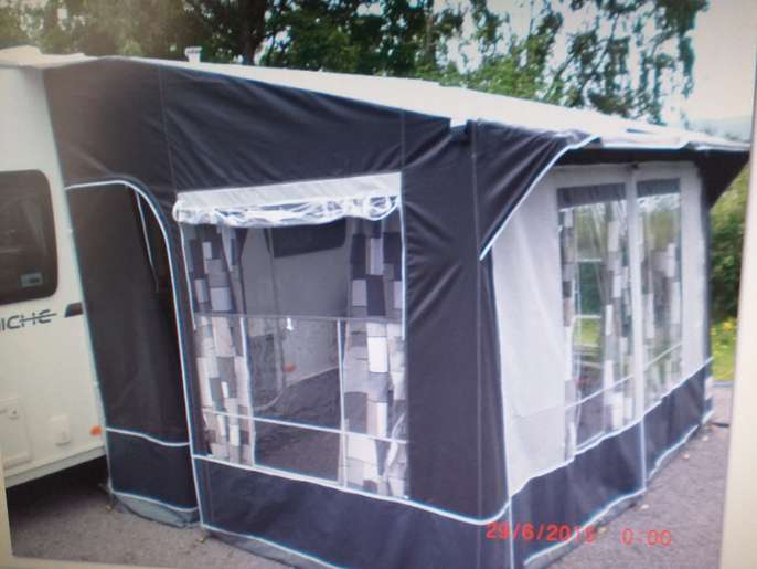 Porch awning small hole in roof which has been repaired. Steel poles. Ground sheet. Curtains. Storm straps Good condition. 380 × 240