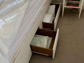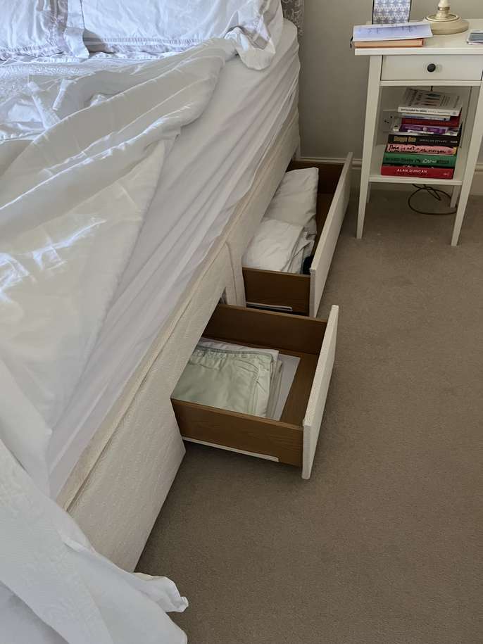 Double bed 150x200 john lewis with padded topping on mattress in excellent condition like new with head board linen material 4 drawers underbed