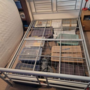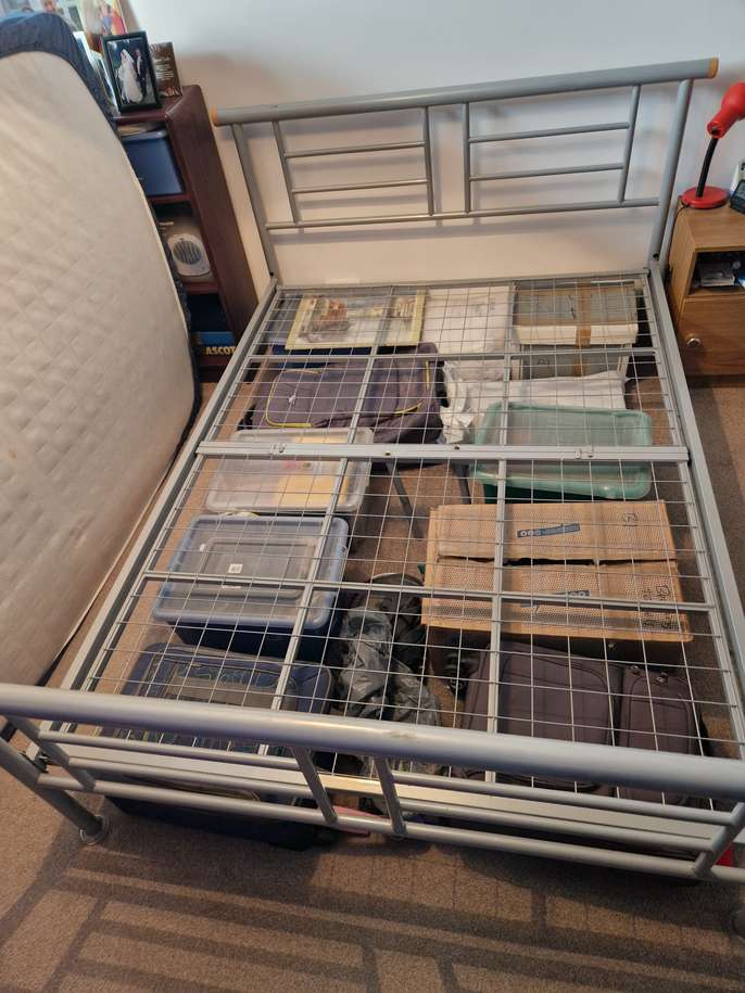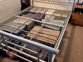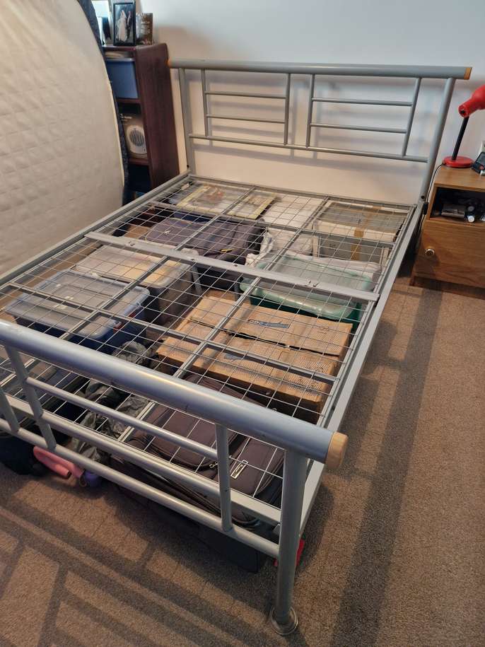 Metal frame with wooden ends to header & footer. Main base frame 145 x 203 cm/ 57" x 80". Foot end 70 cm H x 157cm W. Head end 95cm H x 157cm W. Floor clearance 28cm. Mattress also available but listed separately. Must be able to collect from South Lancing (2nd floor flat).