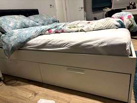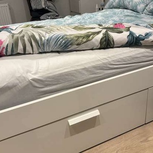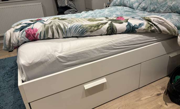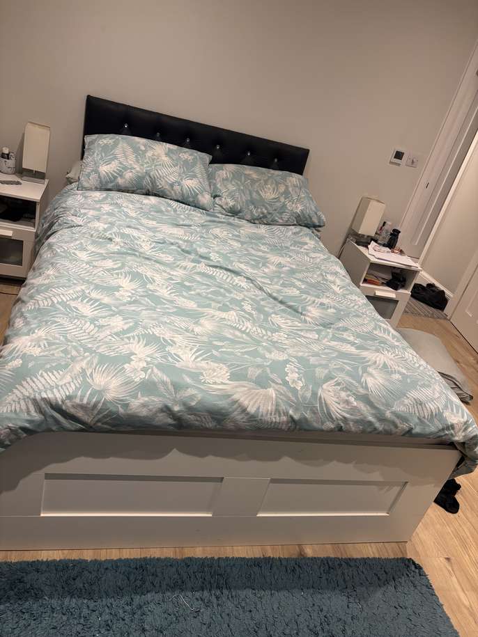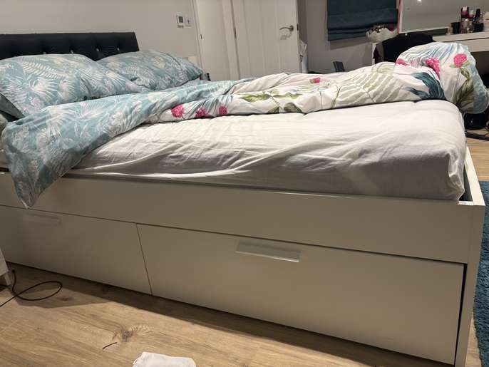IKEA Double bed frame with 4 draws underneath. Mattress is available too if you want it. Available to pick up from 1st December. Dimensions attached with pictures. **Collection Only**
