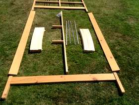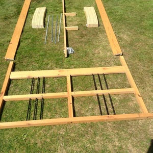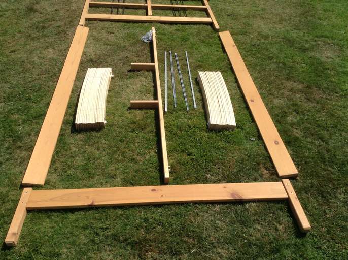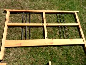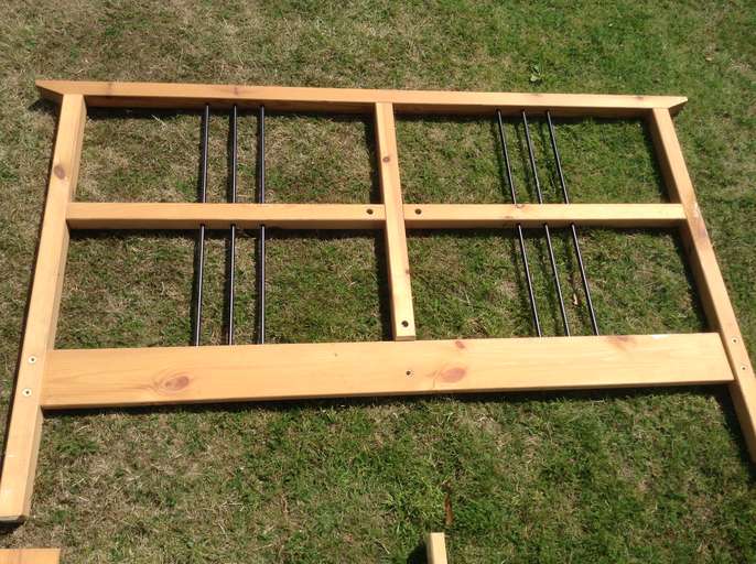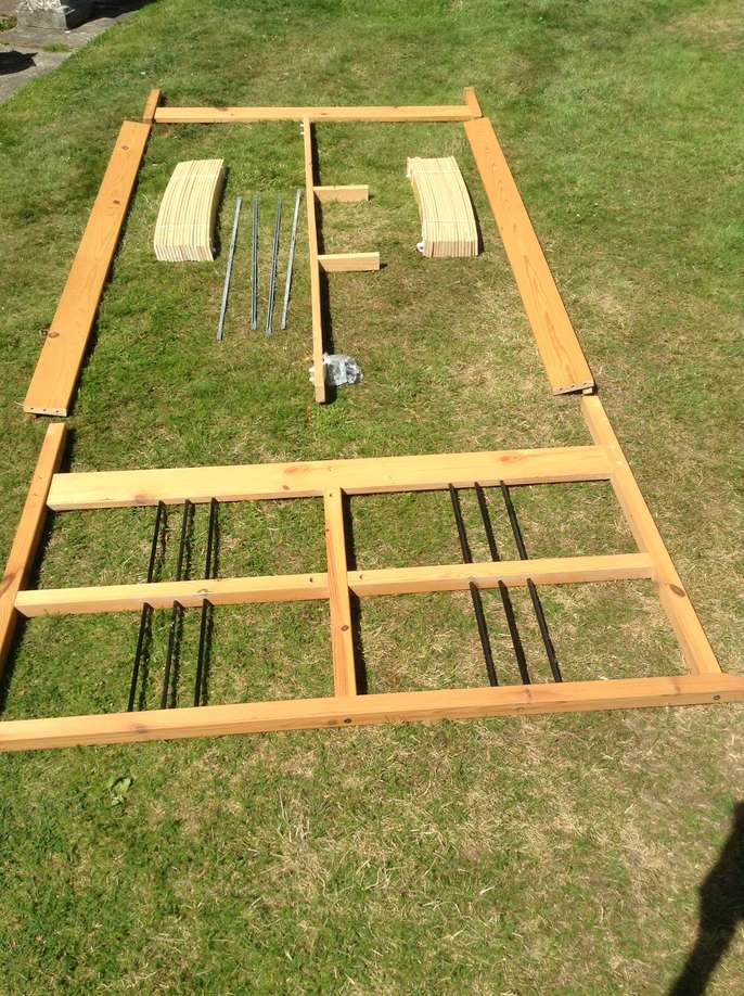 IKEA pine double bed frame. Size 6'9" long, 4'8" wide, headboard height 3'8". Good condition.