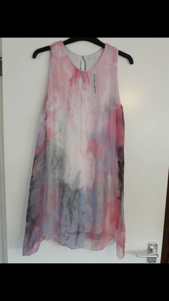 Husen Moda dress/tunic New unworn with tags Size 10 Length from shoulder to hem approx 80cm This is two layered with white silky stretchy under layer with a chiffon over layer 100% silk Hand wash