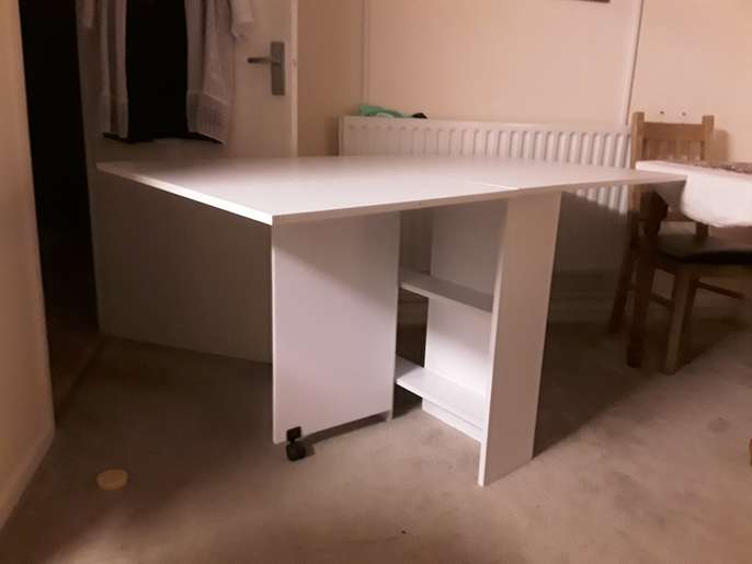 Wayfair,white table ,full lenth 55 inches width 31 inches ,folded down to 8 inches by 31 inches Found that because of my disability it ie not easy for me to use ,