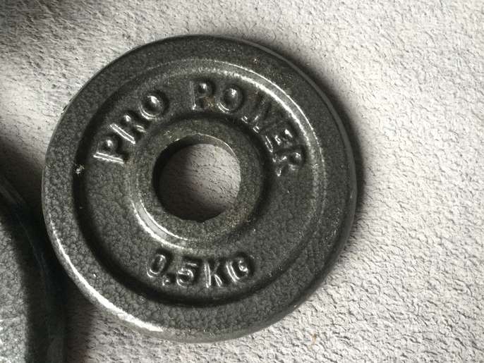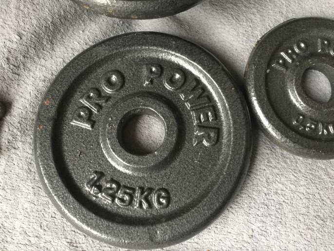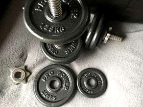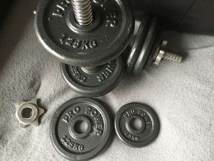 Set of two Pro Power dumbbells. 4 x 1.25 kg weights per set 2 x 0.5 kg weights per set Plus bar and locking nuts Total weight of set 14 kgs Hardly used. Collection only please.