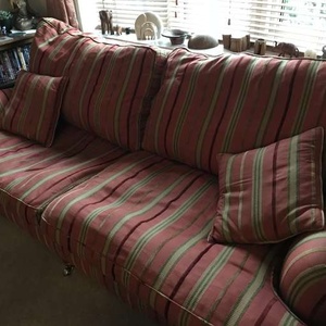 Lansdowne - 90H x 209W x 107D cms. Feather cushions, about 6 years old. Slight sun fade on back, well loved. Very comfy lounger. Available at beginning of October.