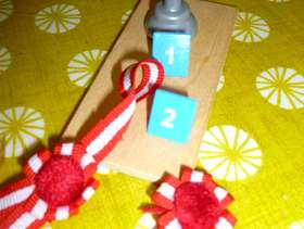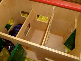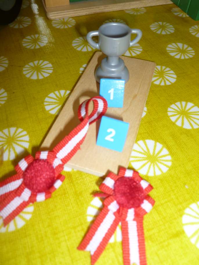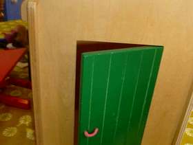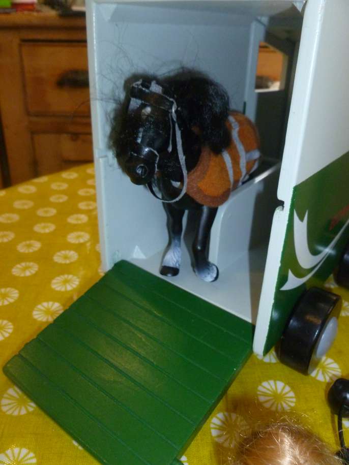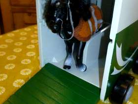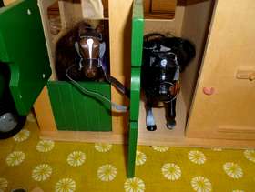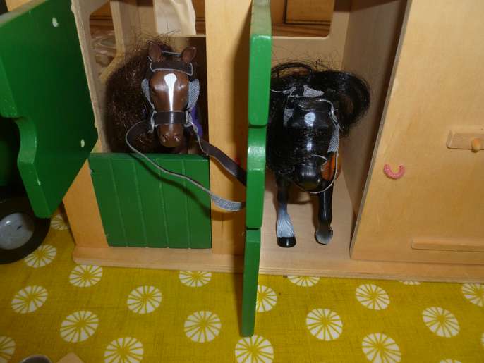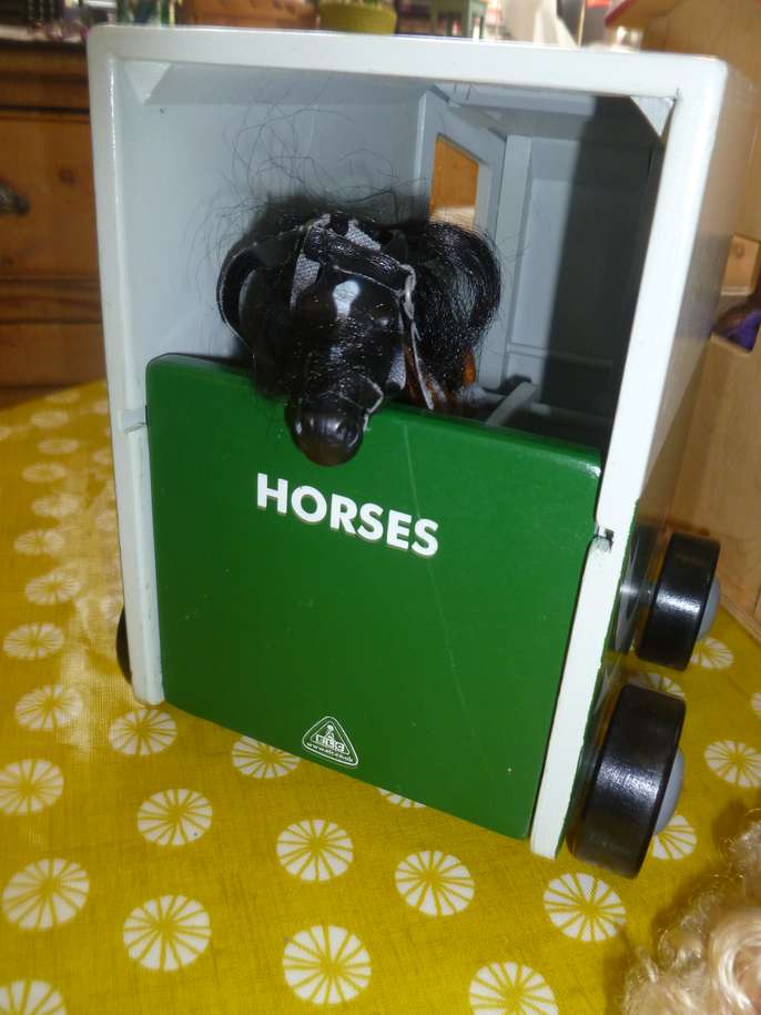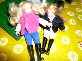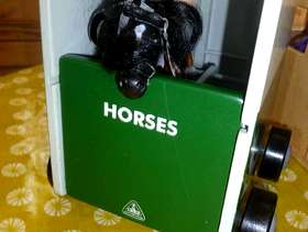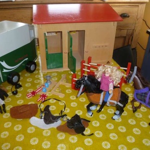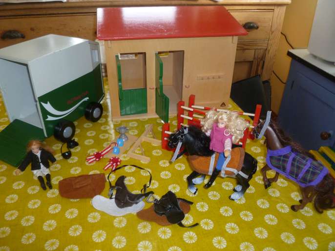 ELC wooden stable play set includes two horses with saddles, under-saddle cloths, fitted coats and bridles. Two girl dolls dressed in riding gear. (Please note: one riding helmet is missing the bit of plastic to do it up, I've tried to show in photograph). The stable fits together using tiny wooden pegs and dismantles to pack flat when not in use. It has two split opening doors on front, a side door and three inside sections, two stables and a tack room. The roof comes off for play. (There is a saddle rack but I can’t see where that fits! Also one little peg missing on that, please see photo). Includes three jumps with removable bars. Also two rosettes, 1st and 2nd place markers and a winner’s cup. The horsebox is also wooden. It has a drop down back door to allow horses inside. When the door is in down position it’s inclined to drop down one side, I don’t know why as it’s all there and when it’s up it fits fine. This has been well played with but still lots of play value left. Can be seen before purchase if that helps. We are in North Camp Farnborough. Lovely toy to keep at Grandparents house for small visitors, which is what we have done!!