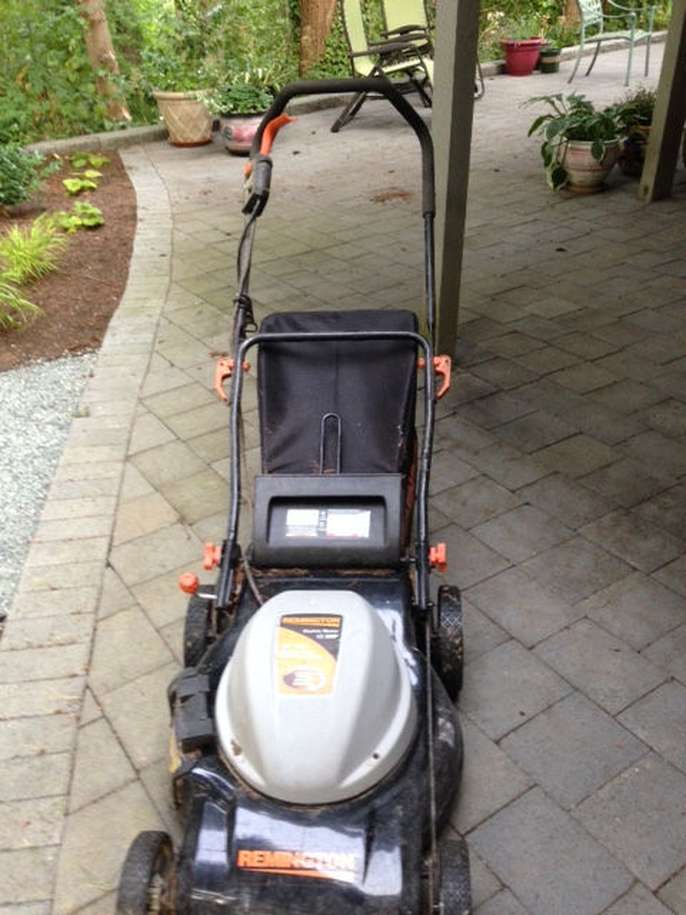 Remington 12 amp electric lawnmower. 19 inch cut, mulch bag, side discharge, powerful, lightweight, quick & easy, super condition.