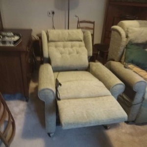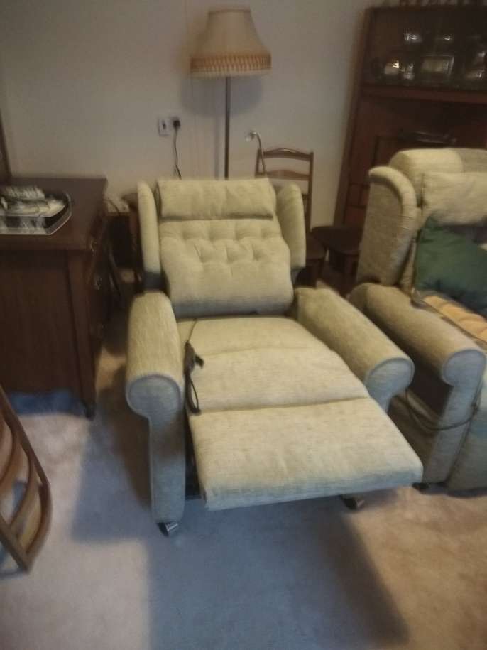 This is a single motor chair with an integral reading light. Very comfortable, in excellent condition and fabric covered of a pleasing colour. Easily accessible in Kington. Easy to transport because the back is removable.