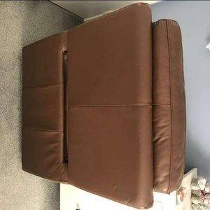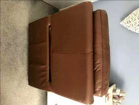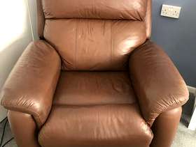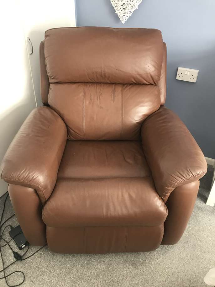 Brown leather rise and recline armchair, slight wear marks to front can be hidden with a cushion. Full working order.