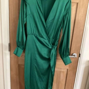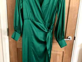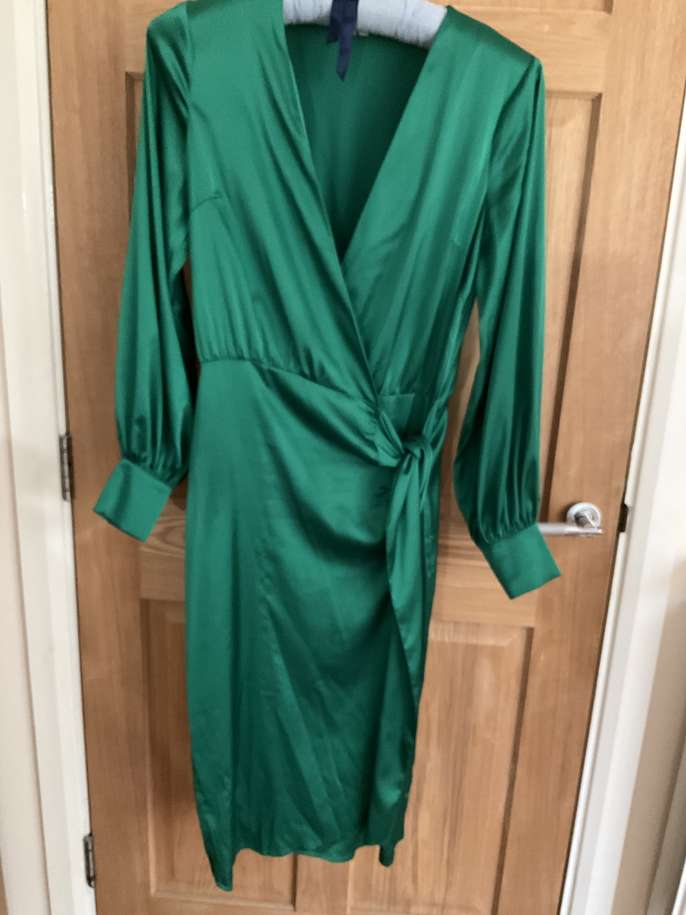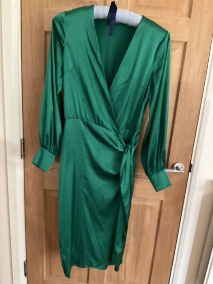 Lovely satin Emerald Green dress with little covered buttons on cuffs. Worn once with lots of compliments. Nice colour for St. Patrick’s Day ! Brand: Never Fully Dressed ( made in England for John Lewis) Cost: £99.99 new Size 12/14.