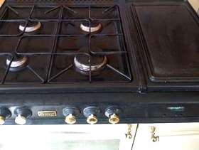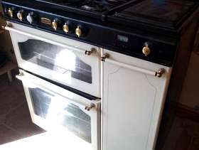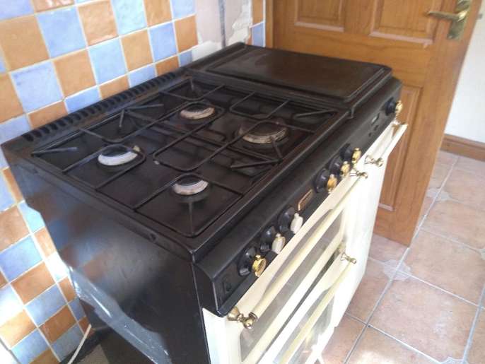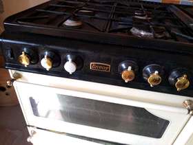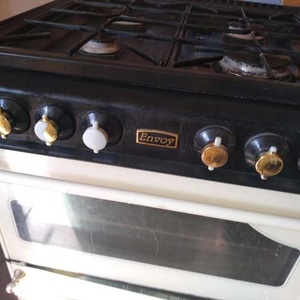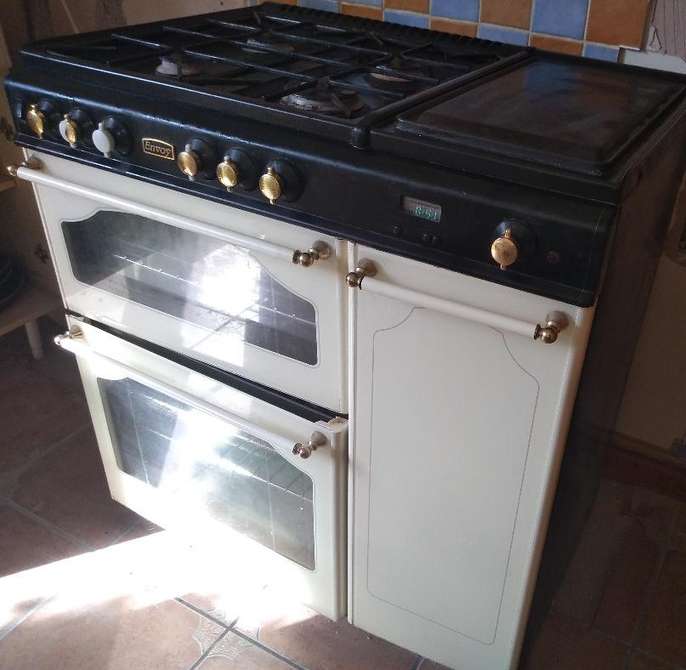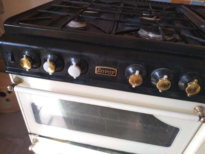 Well used gas cooker. Showing signs of wear (the control knobs can be replaced and bought online) but still fully functional. Side hot plate, double oven, grill (in the top oven) and side cupboard for storage or warming. Partial self-cleaning, Flat hot plate, Grill Number of Ovens: 2 Height: 36 in Depth: 24 in Width: 34 in