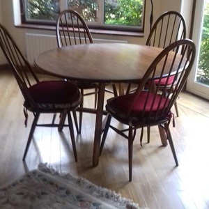 Retro Windsor set of 4 Quaker style chairs and round drop leaf table. Elm wood. Good condition.