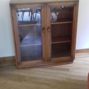 Retro Windsor Ercol display cabinet/bookcase. Double glass doors with two shelves.