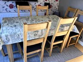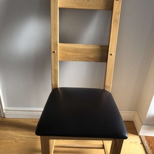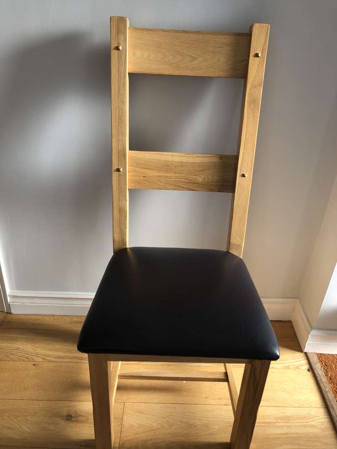 Evans Set of Eight Solid Oak Furniture Dining Chairs With Dark Brown Seatpads. Barely used and in perfect condition - only selling to make more space for kids play room. These chairs cost £120 each when new - This is a real bargain - ideal for a new dining room ready for Christmas